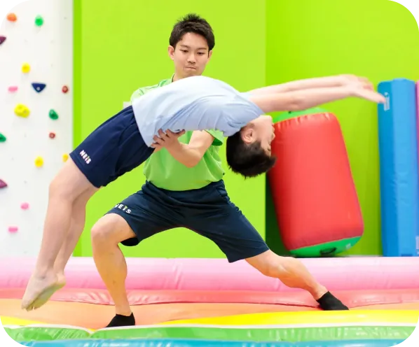 体操の基本となる倒立、柔軟などを中心とし、学校体育で行う技からどんどん技にチャレンジしていくレッスン内容です。