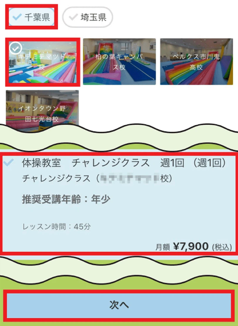 体験をされた教室及びクラスを選択し次へ