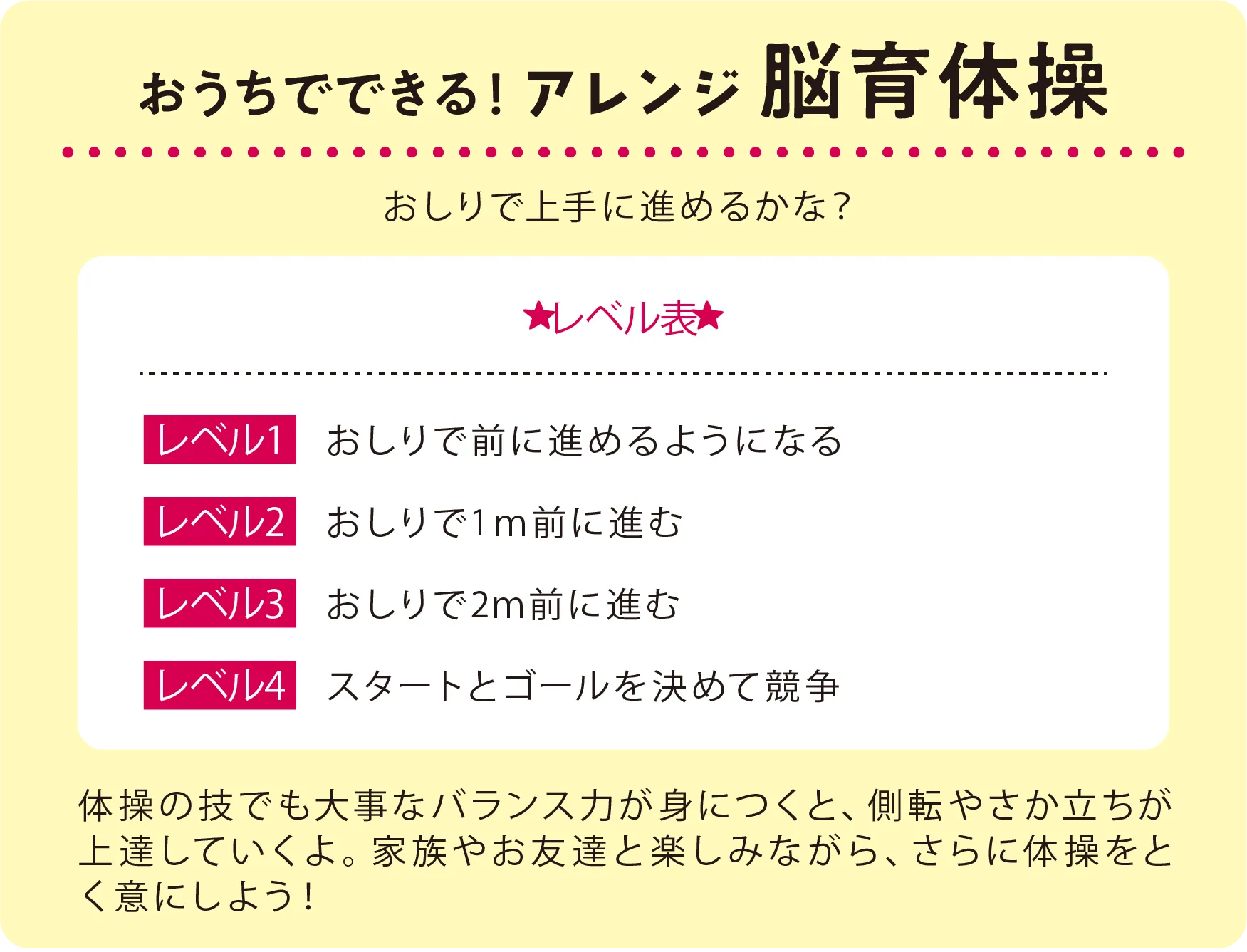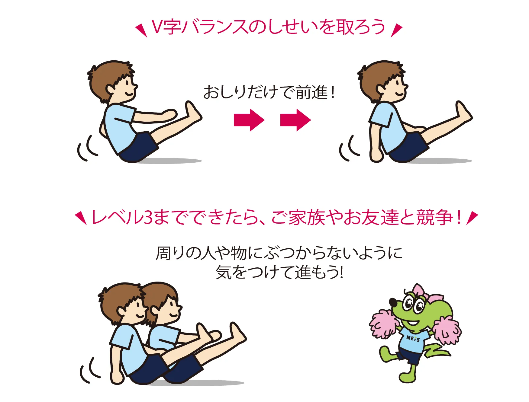 「V字バランス」のしせいを使った脳育体操です。バランス力はもちろん、体幹(たいかん)がきたえられ、しせいが良くなり集中力が続くようになります。まずは「かたはばに足を開いたV字バランス」のしせいを取ります。次に「1・2!1・2!」と声を出しながら、歩くときと同じようにかた手とかた足を同時に動かし、体をひねりながらおしりで前進します。なれてきたら、さらに早く進めるようにちょう戦してみましょう!