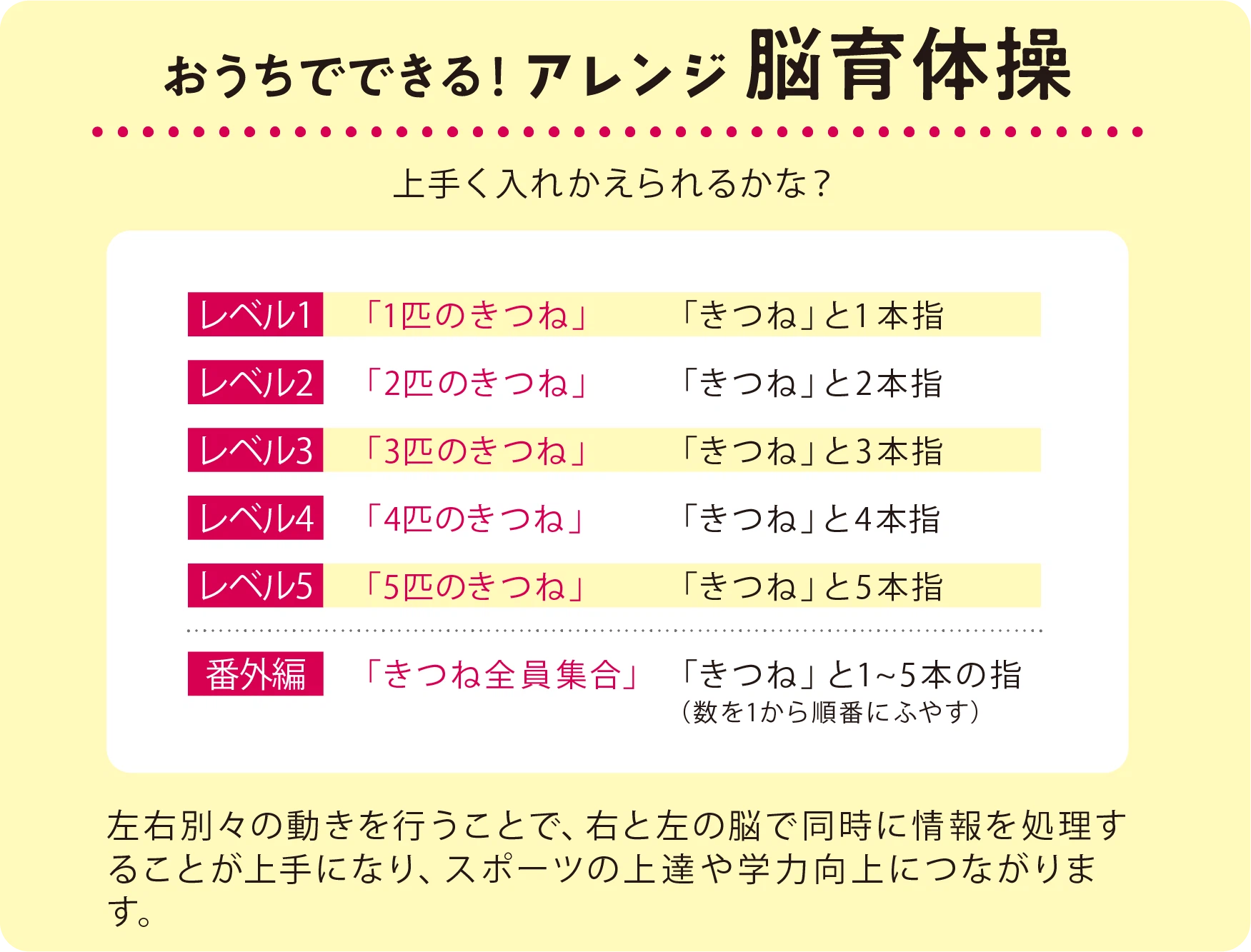 手指を使った脳育体操です。左右別の動きが同時に行えるようになるだけでなく、思考や判断のスピードが速くなります。その結果、スポーツ面では的確な判断と行動ができるようになり、勉強面では集中力や記憶力の向上が見こまれるため、学力が向上しやすくなります。まず、片方の手で「きつね」を作り、もう片方の手は数字の「1」を表す1本指をつくります。そして「きつね」と数字の「1」を入れかえることができたら成功です。