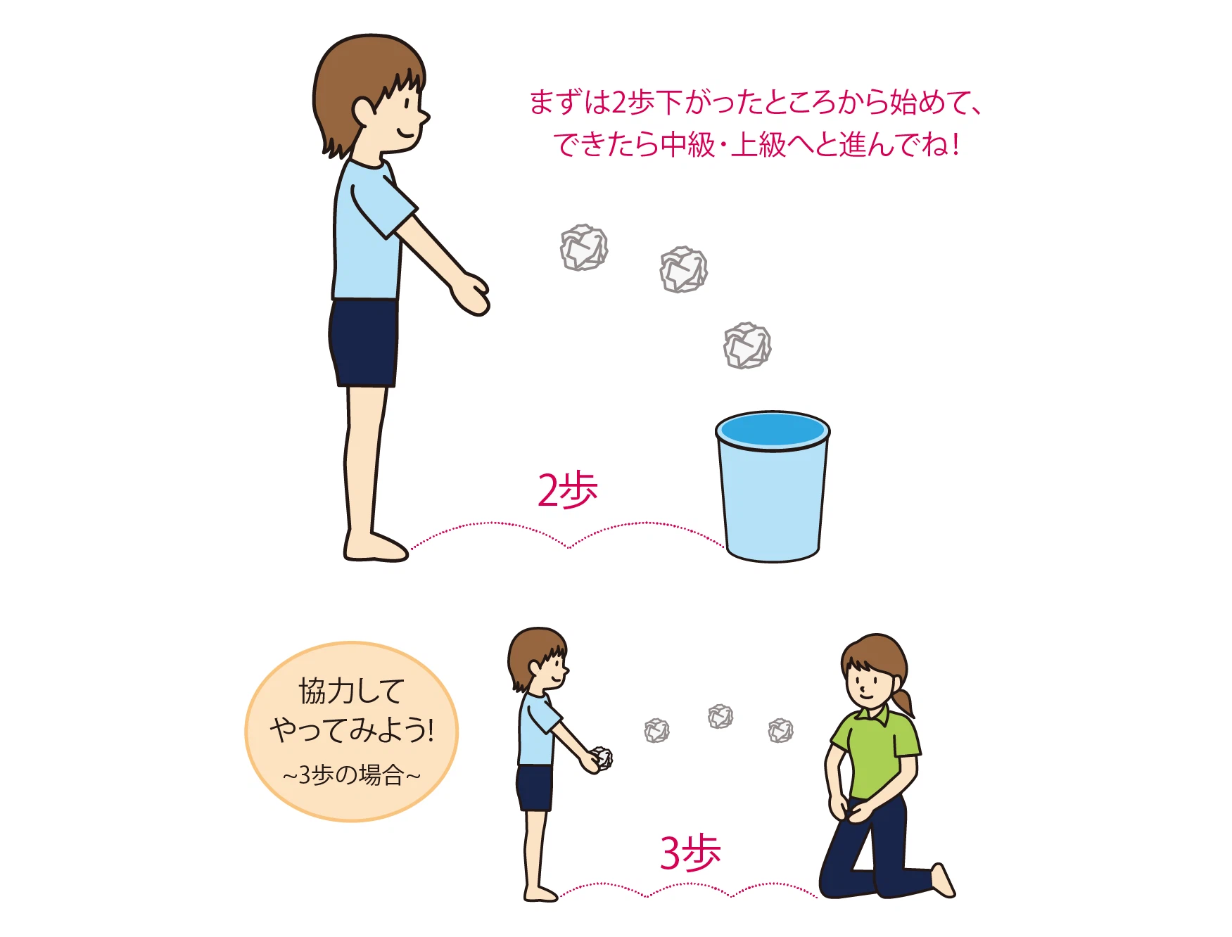 狙った場所に物を投げる脳育体操です。この脳育体操を行うことで、力の調整が上手になります。その結果、ボールを投げる・蹴るの動きや、体操ではとび箱や倒立技の上達に繋がります。用意するものは新聞紙や不要な紙を丸めたボールと、口の空いたゴミ箱です。離れたところから、ゴミ箱を目指してボールを投げ入れます。少しずつ距離を離したり、連続シュートにチャレンジ!ゴミ箱を使用せずに、親御さまが手で大きな丸を作り、そこにボールを入れる家族レクリエーションもおすすめです。