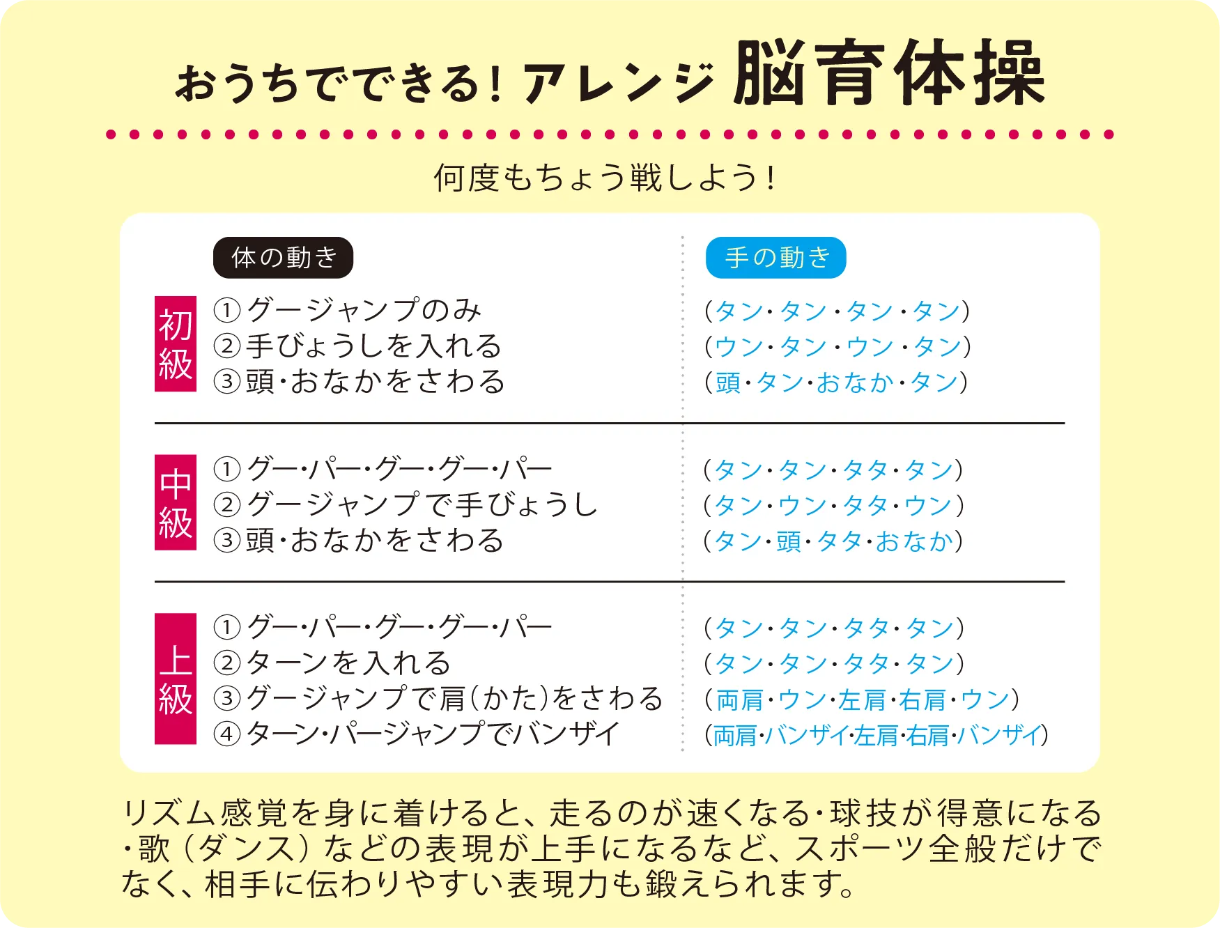 リズムに合わせてジャンプを行いながら複数の動作を重ねていく脳育体操です。「リズム感覚」が身につき、ダンスはもちろん、走ることや球技などはば広く上達がみこめる身体づくりが期待できます。まずは、ご家族の方が手びょうしを行ってリズムを取り、お子さまは初級から順番に行ってください。なれてきたら中級・上級とレベルを上げていきます。全ての動作を同時に行うと 1つのダンスになるので、何度もチャレンジして楽しくリズム感覚をきたえましょう!