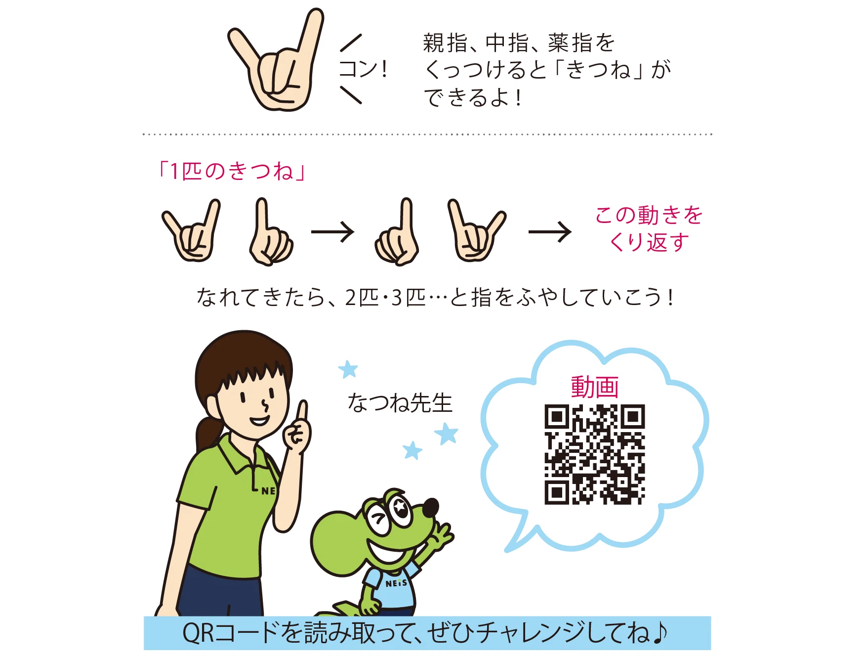 手指を使った脳育体操です。左右別の動きが同時に行えるようになるだけでなく、思考や判断のスピードが速くなります。その結果、スポーツ面では的確な判断と行動ができるようになり、勉強面では集中力や記憶力の向上が見こまれるため、学力が向上しやすくなります。まず、片方の手で「きつね」を作り、もう片方の手は数字の「1」を表す1本指をつくります。そして「きつね」と数字の「1」を入れかえることができたら成功です。