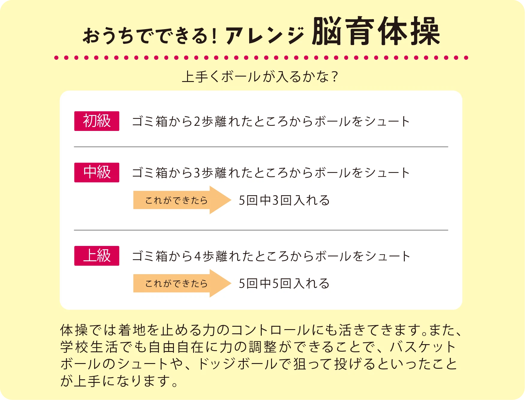 狙った場所に物を投げる脳育体操です。この脳育体操を行うことで、力の調整が上手になります。その結果、ボールを投げる・蹴るの動きや、体操ではとび箱や倒立技の上達に繋がります。用意するものは新聞紙や不要な紙を丸めたボールと、口の空いたゴミ箱です。離れたところから、ゴミ箱を目指してボールを投げ入れます。少しずつ距離を離したり、連続シュートにチャレンジ!ゴミ箱を使用せずに、親御さまが手で大きな丸を作り、そこにボールを入れる家族レクリエーションもおすすめです。
