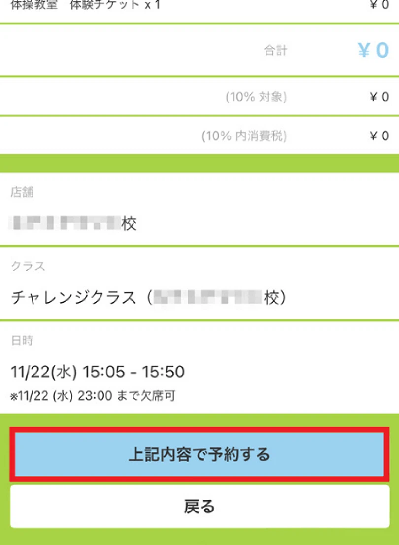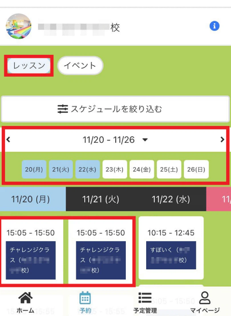 「マイページ」より、「体験する」ボタンから希望校を選択いただくと、定員に空きがあるお日にちのレッスンを予約できるようになっております。